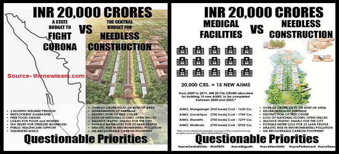 Another example of skewed priorities is the decision of the government to press ahead with the project to refurbish Parliament, the PM’s residence and adjoining buildings. According to a report in “The Wire” (24 March) – “the Ministry of Housing and Urban Affairs has gone ahead and issued a notification amending the land use of five plots for the Centre’s ambitious – and controversial – Central Vista project. After the Central Vista plan was announced a number of architects, urban planners, historians and conservationists had come together under the banner of Lokpath to denounce the move saying it not only unnecessary tinkered with historical buildings, but was result in wasteful expenditure running somewhere around Rs 20,000 crore. They had also questioned the opacity, silence and haste around the project.” Lokpath has come up with an online poster that shows how funds for this Central Vista plan could be utilised for the benefit of the people in these trying times.