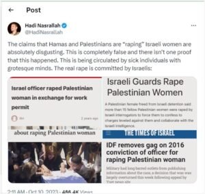 A screenshot of X user Hadi Nasrallah’s post debunking the claim that Palestinians have raped Israeli women in the current outbreak of violence