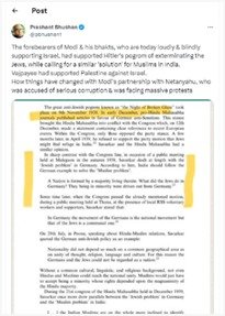 A screenshot of activist and lawyer Prashant Bhushan’s post on X, commenting on the affinities between Zionism and Hindutva