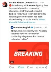 Israeli army tells Anadolu that they have no information confirming allegations that ‘Hamas beheaded babies’