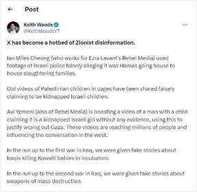 Keith Woods, a free speech activist, argues that Zionist disinformation is spreading across X